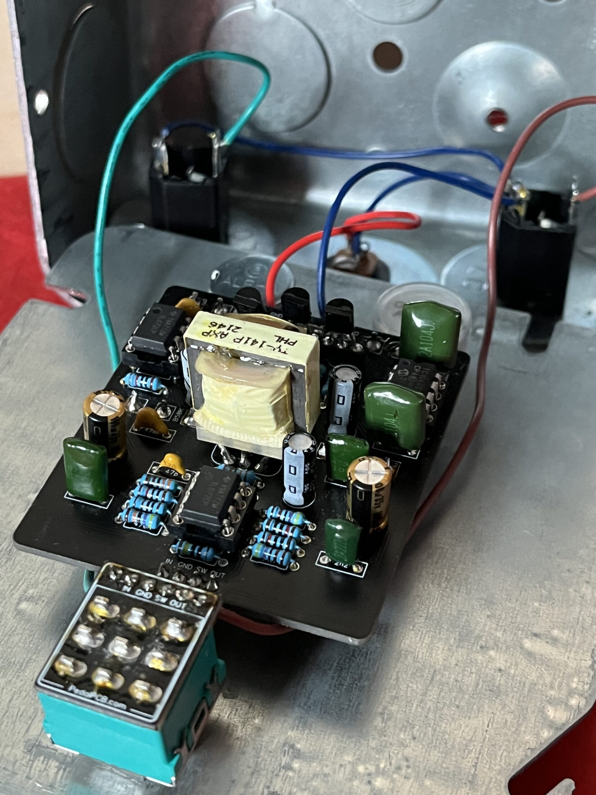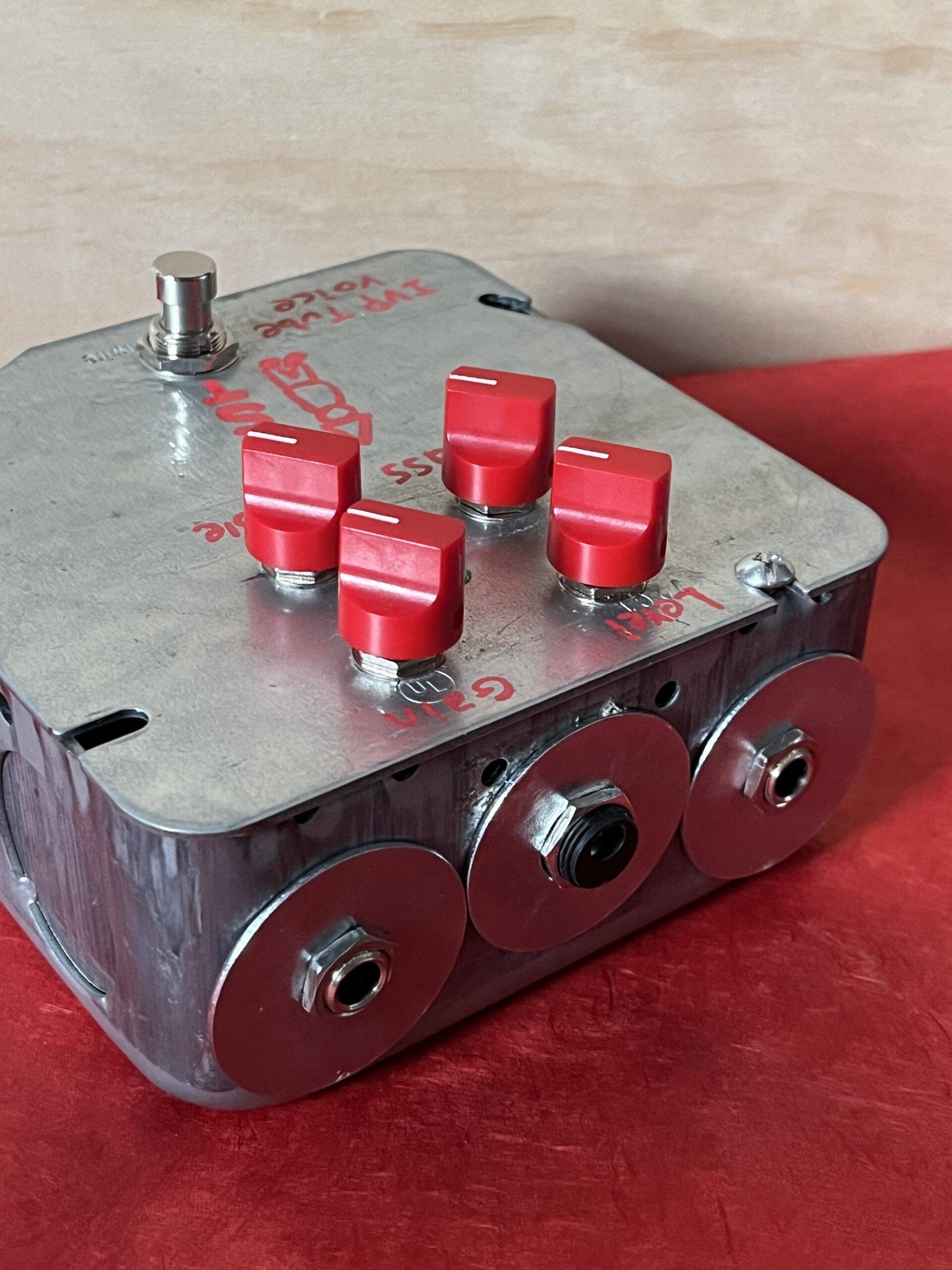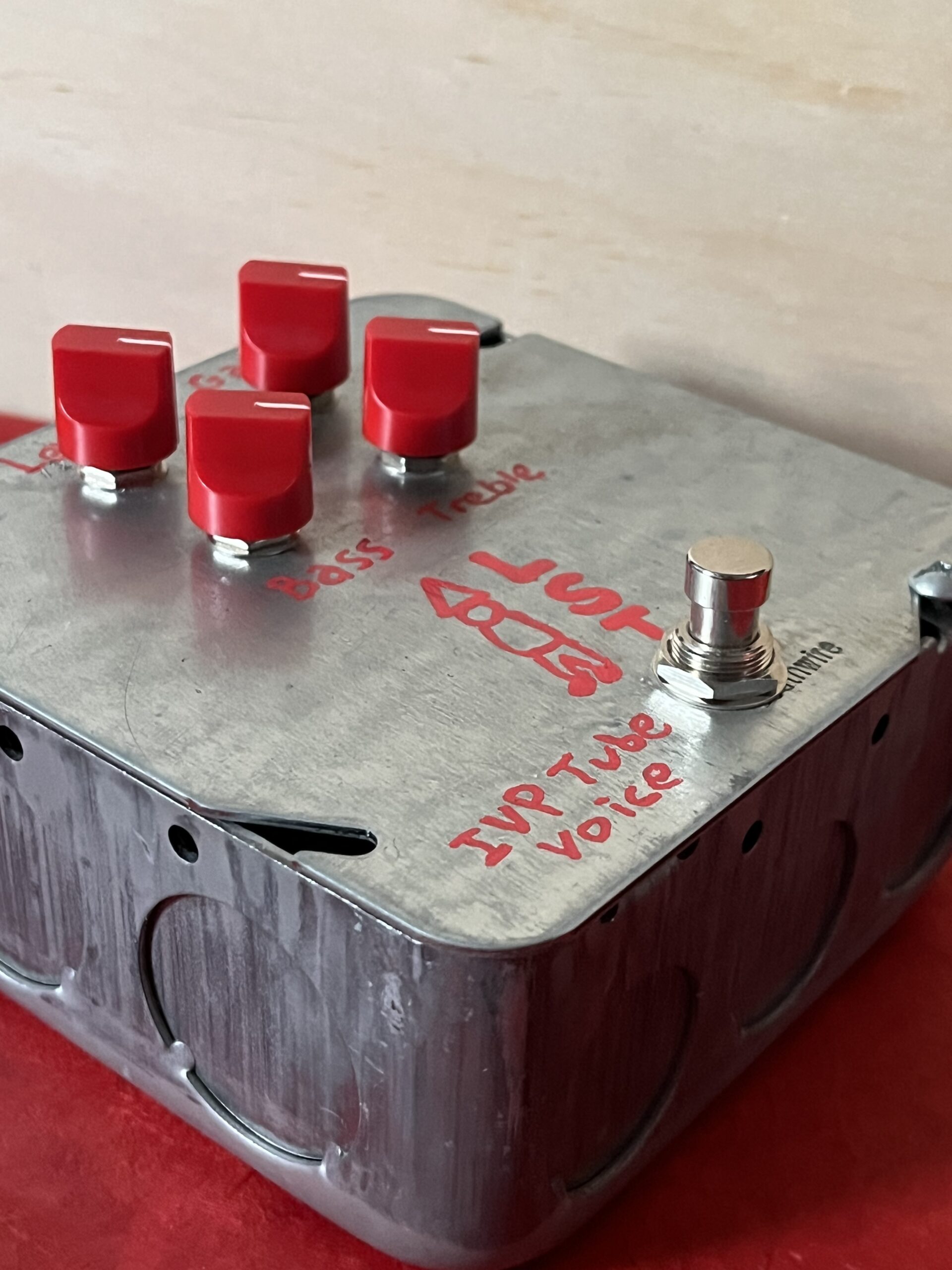 Transformer based distortion based on a rare rackmiunt unit used by the Greatful Dead. Powerful active EQ and beautiful chimey clean tones all the way to pushed amp ripped speaker distortion. Sounds better than a klon in my opinion! And more useful! Enclosed in a utility electrical box with true bypass wiring.